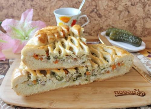 3. после добавьте отварную курицу. И отварной рис. Начинку посолите, поперчите по вкусу и перемешайте. Тесто разделите на две неравные части. Большую часть раскатайте и выложите в сковороду с пекарской бумагой. На тесто выложите начинку.
