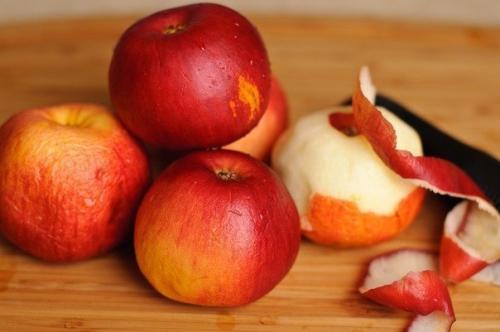 Духовку нагрейте до 180 градусов. Сухофрукты залейте водой и поставьте на 2 минуты в микроволновую печь. Яблоки вымойте, снимите кожуру.