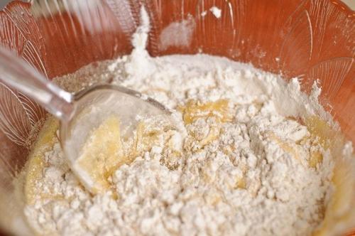 Добавьте растопленное сливочное масло и корицу. Хорошо смешайте. Всыпьте просеянные муку и разрыхлитель и аккуратно перемешайте.