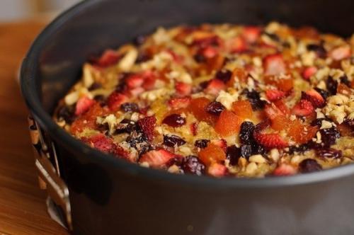 * сухофрукты (изюм, курага, клюква или на выбор) - 100 г, * мука - 1 ст, * разрыхлитель - 1/2 ч. л, * яблоки - 4 шт, * клубника (опционально) - 4-5 шт, * яйцо - 4 шт, * соль - щепотка, * сахар коричневый - 1/2 ст, * масло сливочное - 8 ст. л, * корица - по вкусу, * орехи грецкие орехи - 1/2 ст.