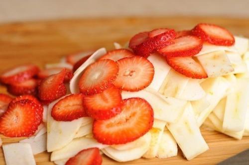 Тонко нарежьте яблоки и клубнику (если используете.