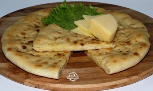 3. готовое тесто разделить на части и каждую часть раскатать на лепешки толщиной в 5-10 мм. На середину лепешки положить заранее приготовленный фарш из свежего осетинского сыра, разровнять сыр на поверхности лепешки на 3-4 см от края лепешки, затем, забирая концы лепешки, постепенно стянуть их на середину и соединить. Нажимом ладони разровнять поверхность пирога.