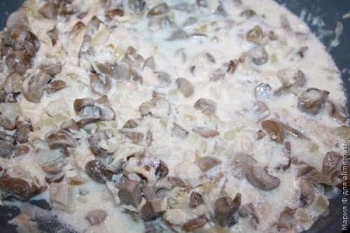 7. далее к грибам добавляем куриную грудку, жарим минуты 2, следом добавляем сливки, и еще пару минут все вместе обжариваем.