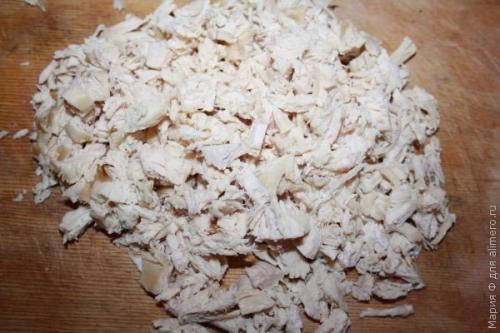 4. теперь перейдем к начинке. Куриную грудку отвариваем, остужаем и нарезаем небольшими кусочками.