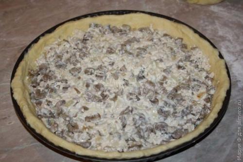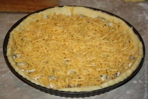 9. следом в эту же форму выкладываем и начинку. 10. Сыр натираем на крупной терке (можно и нарезать тоненькими пластинками) и посыпаем им пирог.