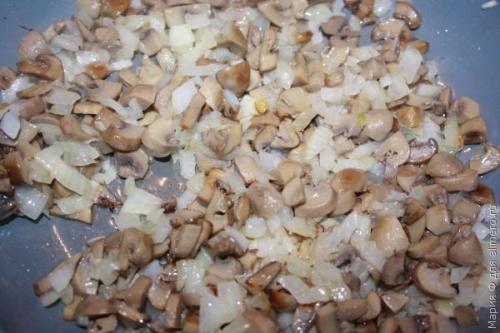 6. репчатый лук мелко нарезаем, добавляем к шампиньонам и жарим до готовности.