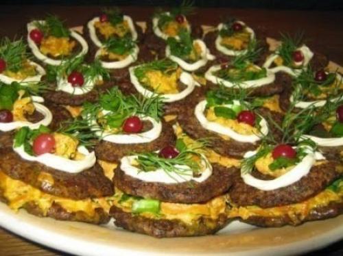 Шаг 3 взять одну "Котлетку" из печёнки, на нее выкложить начинку, сверху немного нарезанного зеленого лука, накрыть второй "котлеткой".