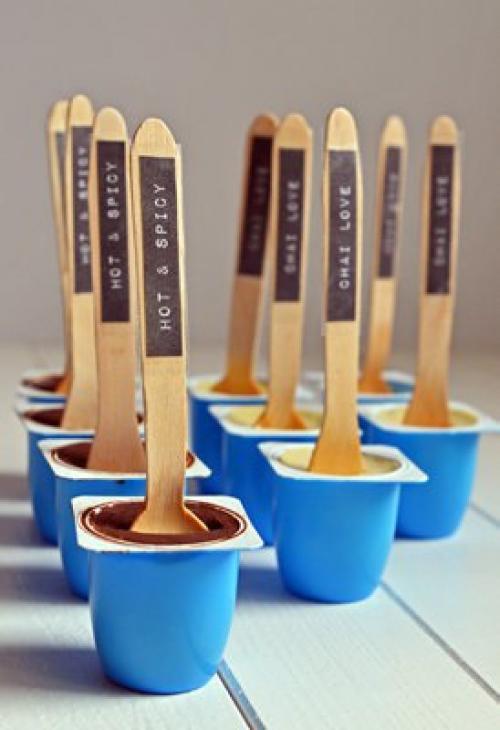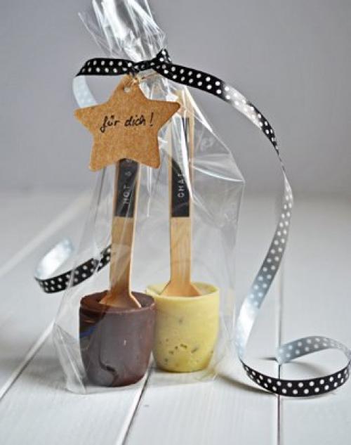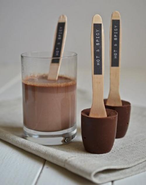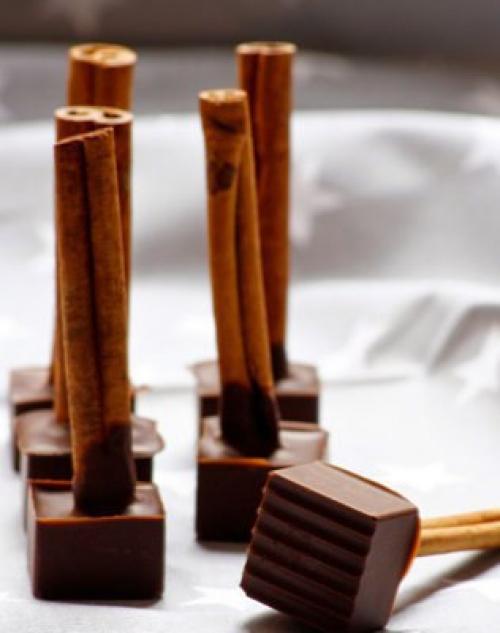 Как только шоколад начнет загустевать, воткнуть посредине деревянные ложечки. Для особого эффекта можно использовать палочки корицы.