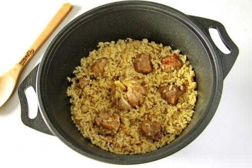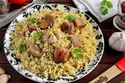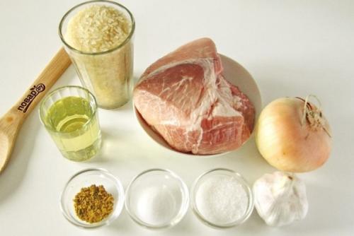 Мы подготовим все ингредиенты. В казан или в сковороду с толстым дном наливаем масло и раскалим его. Положим нарезанный полукольцами лук. Обжарим лук до золотистого цвета. Добавим нарезанное средними кусочками мясо. Посолим мясо по вкусу и готовим на сильном огне до легкой поджаристой корочки. Добавляем горячую воду, сахар, специи и соль (зирвак должен быть слегка солоноватым с учетом риса. Мясо после закипания на минимальном огне под крышкой 20-30 минут тушим. Затем добавим очищенные зубчики чеснока, можно прямо в шелухе (предварительно необходимо снять верхний слой. Добавляем промытый рис. Рассыпаем его прямо сверху, не перемешивая. Доливаем немного воды, чтобы она была выше риса на 1 см, накрываем казан крышкой и готовим на среднем огне до полуготовности риса. Как только вся жидкость впитается, соберем рис Горкой к центру, накроем любой подходящей сверху тарелкой, затем опять крышкой и готовим уже на медленном огне еще 10 минут. Плов готов без моркови. Перед подачей перемешаем его и по желанию добавим свежую зелень. Приятного аппетита!