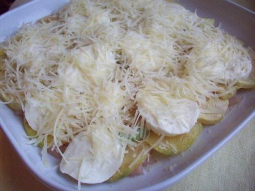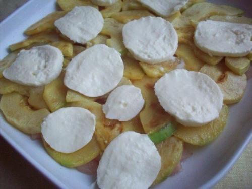3. сверху на куриное Филе (которое нужно было посолить и поперчить) выкладываем ломтики обжаренного кабачка. Сверху - кусочки моцареллы. Посыпаем тертым пармезаном. Сверху кусочки болгарского перца и оливки выкладываем.