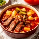 6. влейте в мясо бульон, положите томатное пюре или мелко нарезанные и очищенные от кожицы помидоры.