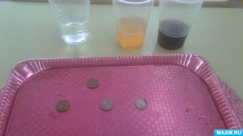 Взяли три стакана. В два налили напитки, а в третий – чистую воду. Опустили монетки одинаковые по размеру и, примерно, одинаковой загрязненности. Контролем служила монетка на подносе.