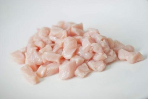 1. берем 1 большую или 2 маленькие куриные грудки, промываем мясо под холодной проточной водой от крови, сушим бумажными кухонными полотенцами от излишков влаги, кладем на разделочную доску и мы срезаем с него хрящи, плеву, а также грудную кость, если таковая имеется. После нарезаем курицу мелким кубиком до 1 - 1, 5 сантиметров и оставляем нарезку на доске. Разогреваем духовку до 240 - 260 градусов цельсия.
