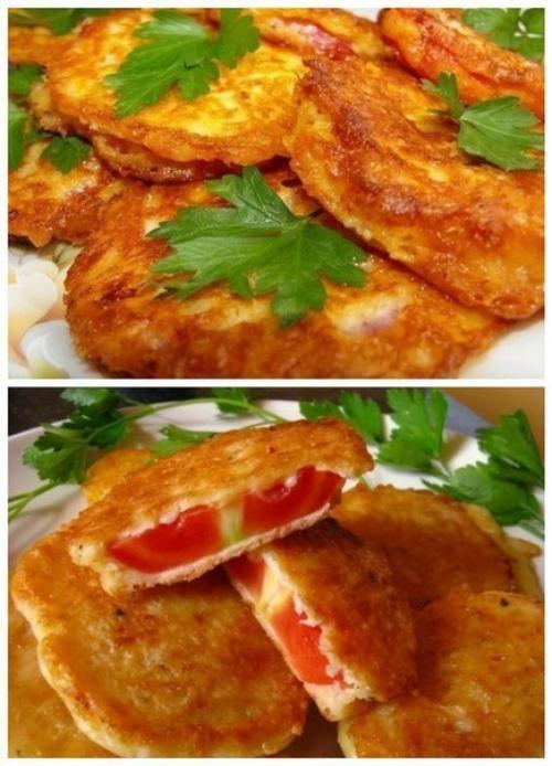 4. помидоры обмакивать в кляр и выкладывать на сковороду. Обжаривать с двух сторон до золотистой корочки.
