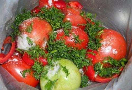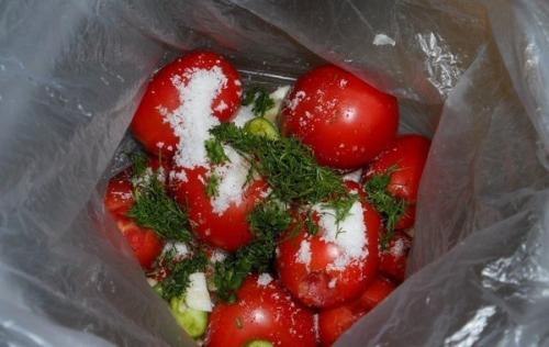 4. мы добавляем соль и сахар. Завязать пакет и хорошо встряхнуть в нем помидоры.
