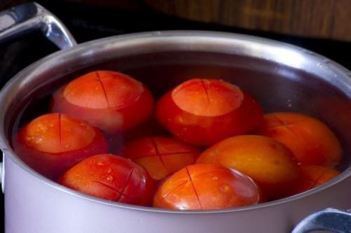 Помидоры нужно промыть, нарезать крестообразно с кончика, залить на пару минут кипятком, слить воду. Удалить с помидоров шкурку.