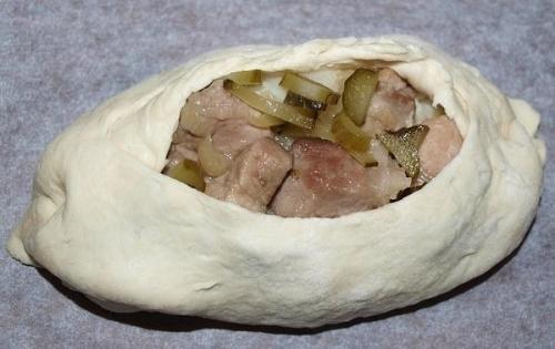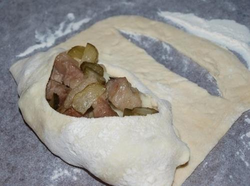 5. завернуть тесто поочередно с двух сторон, чтобы разрезы оказались посередине пирожка и как бы друг над другом. Защипать края, придав изделию форму лодочки.