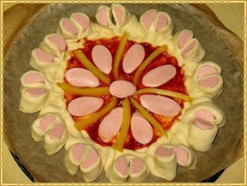 Раскатать тоненько дрожжевое тесто на присыпанном мукой столе. Переложить на противень для выпекания. На тесто уложить кружочком кусочки сосисок, сначала порезав вдоль, затем поперёк на 3 части.