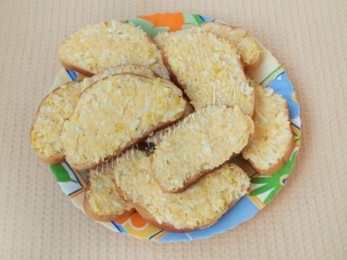 На средней тёрке натереть твёрдый сыр и яйца, добавить плавленый сыр и майонез, выдавить через пресс чеснок. Всё хорошо перемешать.