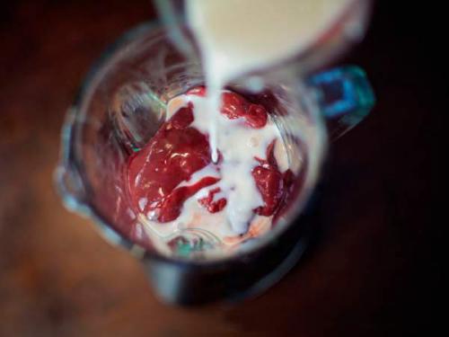 После этого, перекладываем печеночные кусочки в емкость блендера и сюда же добавляем необходимое количество молока.