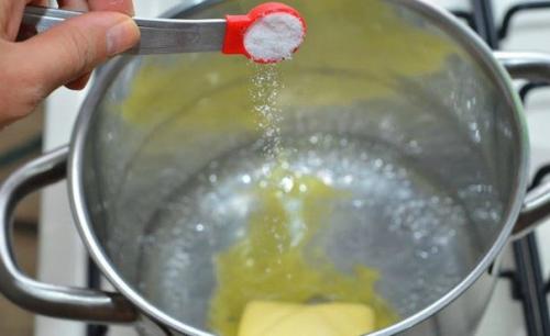 - Когда вода уже начнет закипать, бросить в нее масло, добавить соль и мешать до растворения компонентов;
