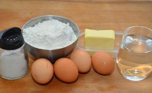 Ингредиенты: 100 гр. Сливочного масла, 4 яйца, 180 гр. муки, 1/2 ч. л. соли, 250 мл. Воды, заварной крем.