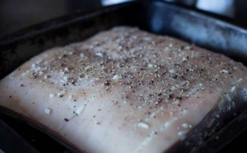 Спустя несколько часов достаньте свинину из фольги, положите на форму для запекания, сверху посыпьте черным перцем и слегка сбрызните маслом (чтобы шкурка не пригорела. Класть нужно шкуркой вверх.
