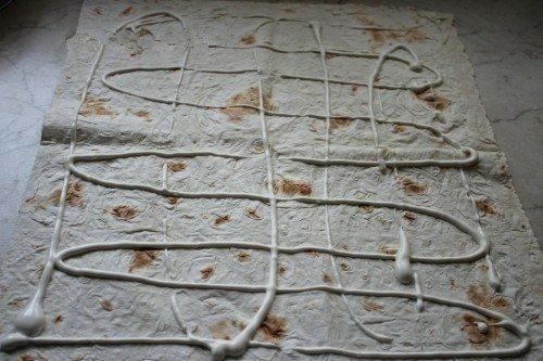 1. на лаваш произвольно мы наносим майонез. Пекинку и огурец нарезаем соломкой. Небольшими кусочками нарезаем колбасу и сыр.