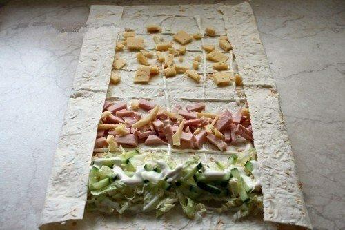 2. мысленно разделяем лаваш на 4 части. На первую часть укладываем пекинку и огурец (не жалеем, это основная начинка), можно их ещё немного полить майонезом - так сочнее. На вторую часть укладываем колбасу и совсем немного сыра. Две остальные части посыпаем сыром. Загибаем края (как будто готовим большую шаурму) и аккуратно сворачиваем, начиная с того края, где уложены овощи.