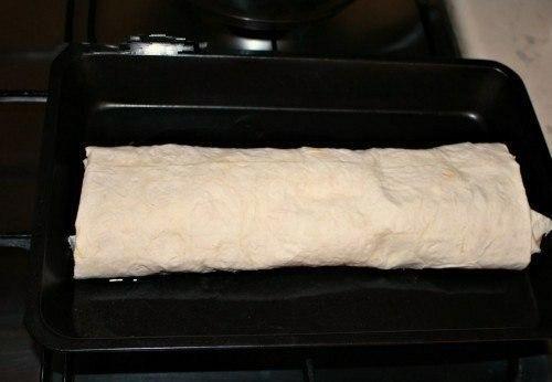 3. сворачиваем не туго, а в четыре слоя: один заворот - овощи, второй заворот - колбаса, ещё два заворота - и рулет готов!