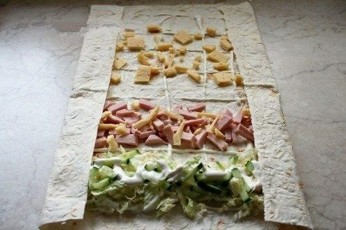 Образно разделяем лаваш на 4 части. На первую часть укладываем пекинку и огурец (не жалеем, это основная начинка), можно их ещё немного полить майонезом, так сочнее. На вторую часть - укладываем колбасу и совсем немного сыра. Две остальные части посыпаем сыром. Загибаем края (как будто готовим большую шаурму) и аккуратно сворачиваем, начиная с того края, где уложены овощи.