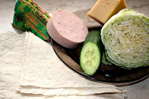 На лаваш произвольно мы наносим майонез. Пекинку и огурец нарезаем соломкой. Небольшими кусочками нарезаем колбасу и сыр.