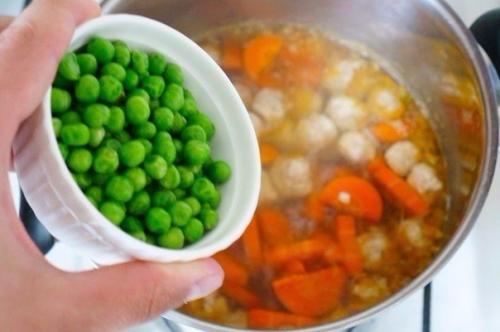 8. теперь всё просто - иногда снимайте пенку ложкой с поверхности супа. Периодически ножом прокалывайте морковь. Как только она стала достаточно мягкой для вас, засыпайте горошек.