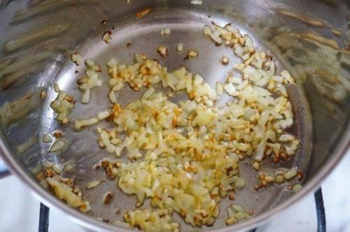 3. на оливковом масле в кастрюле обжариваем половину лука и чеснок до уверенной румяности.