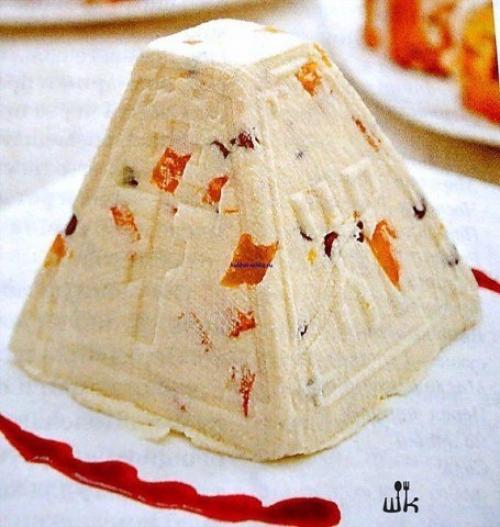 Затем осторожно перевернуть пасху на блюдо, снять марлю, пасху украсить цукатами или изюмом.