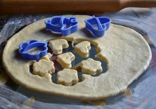 7. рабочую поверхность присыпать мукой, раскатать тесто толщиной примерно 2 см. Формочками вырезать фигурки. Таким образом, если формочек нет, сделайте как я - стаканом вырежьте кружки и сделайте надрезы с 4 сторон, не доходя до середины. В процессе жарки получатся цветочки.