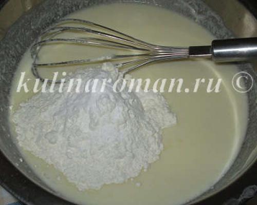 2. Дальше добавляем муку, смешанную с пищевой содой. Тщательно перемешиваем продукты, чтоб не было комков.