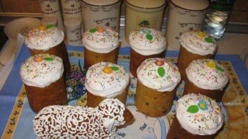 Заполните форму на половину тестом и дайте ему подрасти, практически до края формы. Лишь в том случае, если вы не будете использовать сахарную глазурь для украшения кулича тогда покройте верх выпечки взбитым желтком. Выпекайте при температуре 180 градусов до готовности (средняя пасха выпекается 35-45 минут. Глазурь: до яичных белков добавьте немного соли и одну - две ложки сахара, взбейте белки до густой пены. Горячие куличи полейте взбитыми белками и посыпать кондитерской посыпкой или цукатами.