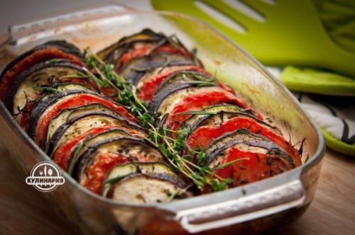 5. запекать блюдо в духовке при температуре 180-190 с, пока картофель не станет мягким. К этому моменту баклажаны и кабачки должны подрумянится.