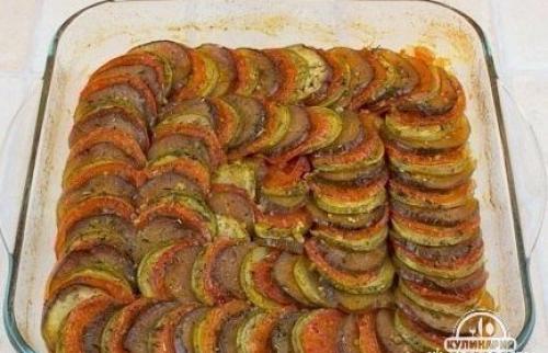 В в большую форму выложить соус ровным слоем. выложить, чередуя, кружочки помидоров, кабачков и баклажанов. Посолить.посолить. смесью масла со специями смазать. закрыть форму фольгой. в разогретую до 180 градусов духовку. Готовить 1-2 часа (в зависимости от желаемой мягкости овощей. Затем фольгу снять и готовить еще 30 минут. Приятного приятного аппетита!