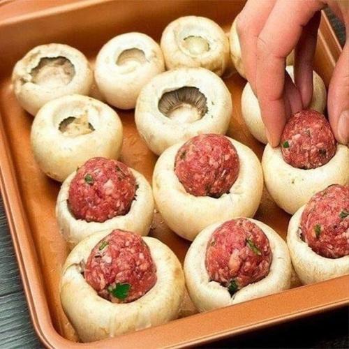 2. грибы надо промыть и срезать с них ножки. Разложите грибы на противень, размером 20 см x 24 см, смазанныи оливковым маслом. В шапочки грибов положите мясные тефтели.