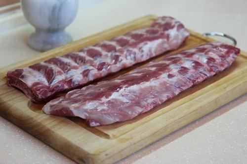 4. застилаем противень фольгой, лучше в 2 слоя, и кладем на него ребрышки мясистой стороной вниз.