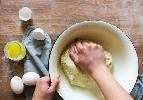 Муку просеиваем и смешиваем с солью. Добавляем дрожжевой раствор, яйцо и растопленное масло комнатной температуры.