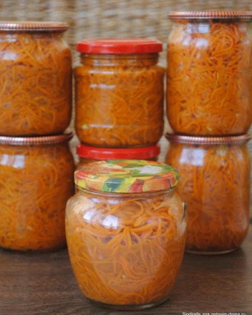 Морковь нужно на терке натереть. Добавьте соли и сахара, смешайте и оставьте на двадцать минут. После добавьте черный и красный перец, размешайте о снова оставьте на двадцать минут. Добавьте уксус и выдержите тридцать минут. В это время лук мелко нарежьте и обжарьте на масле. Как только лук будет готов уберите его, а масло оставьте. Добавьте в масло кинзу и доведите до кипения. Полученным соусом полейте морковь и снова оставьте минут на двадцать. Чеснок измельчите и добавьте в салат. Готовый салат разложите в банки и закатайте. Приятного аппетита!