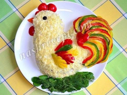 Осталось только украсить салат петух: из маслины делаем глазик петуха, из болгарского перца - гребешок, бородку, крылья и хвост, из моркови - клюв. Можно дополнительно украсить блюдо с салатом зеленью. Салат готов! Приятного аппетита!