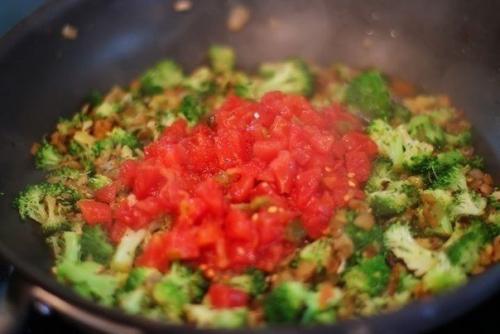 4. добавьте лук и брокколи в сковороду, где готовились бекон и курица. Пожарьте на среднем огне, периодически помешивая, пока брокколи не станет мягкой, около 10 минут. Добавьте измельченный чеснок и готовьте, постоянно помешивая, около 30 секунд. Выложите в сковороду помидоры, рис, курицу и беконом и перемешайте. Уменьшите огонь до минимума.