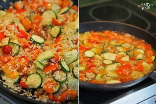 3. в сковороду всыпать рис, перемешать и готовить 2-3 минуты, чтобы каждая рисинка прогрелась и впитала все ароматы овощей.