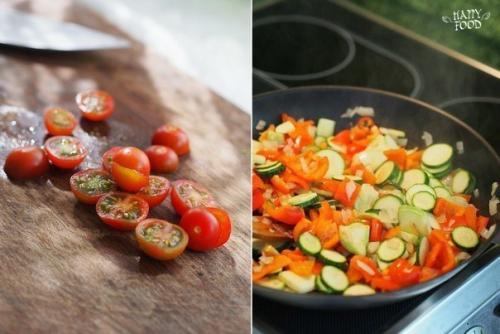 Шафран залить 50 мл кипятка и дать настояться. Перец очистить и нарезать средними кубиками. Патиссоны и цукини средними кусочками нарезать.