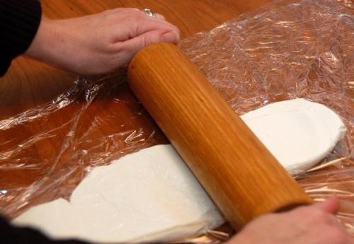 Расстелить пищевую пленку на столе, выложить сыр, накрыть еще слоем пленки и раскатать скалкой в пласт толщиной в сантиметр.