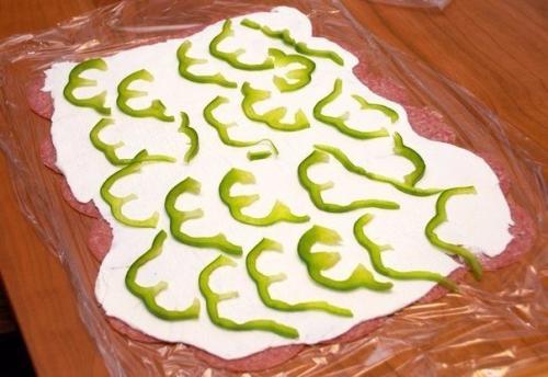 Снять пленку уже с другой стороны и разложить на сыре зеленый перец.